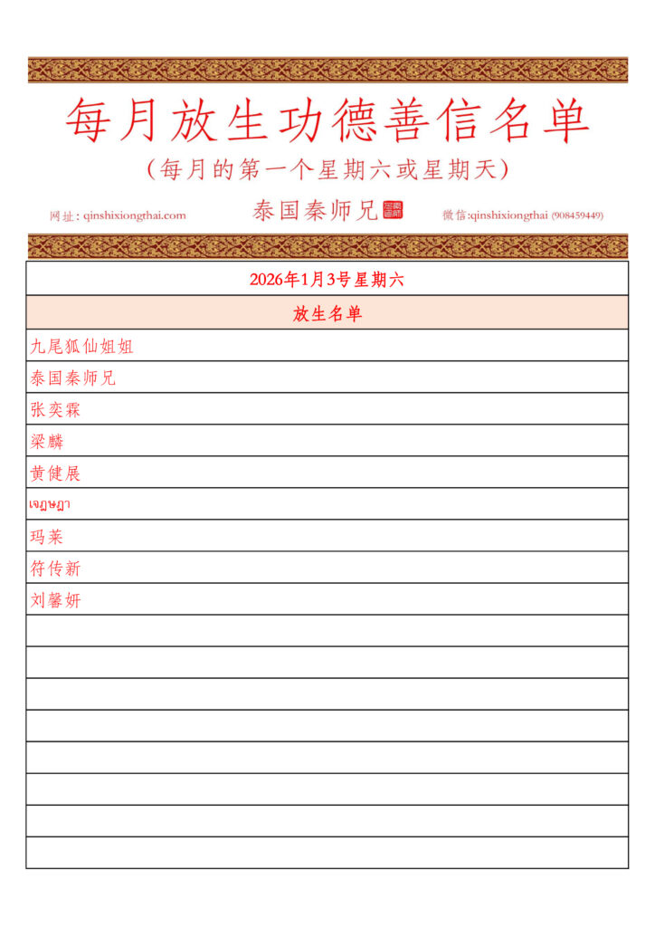 2026年一月每月放生活动 善信名单