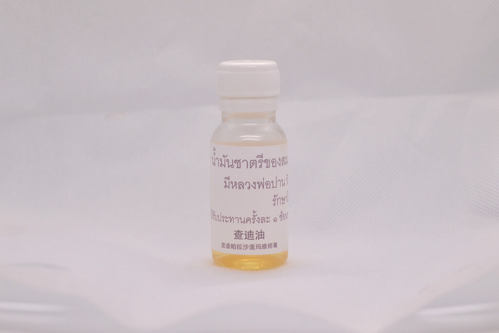 弟子今恭请所有佛,以初佛为首,及毕支佛,四大果位圣僧, 天神护法,梵天,及弟子过往世一直到今世所有恩师,以龙普版师祖及龙婆帕拉沙蓬玛雅师尊为主,所有功德力,慈悲加持此查迪油,
