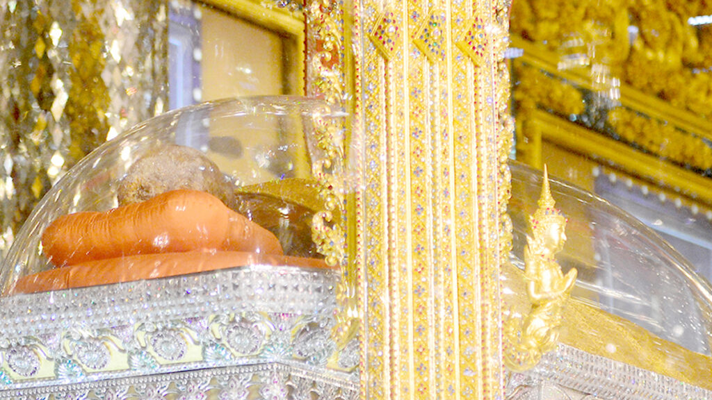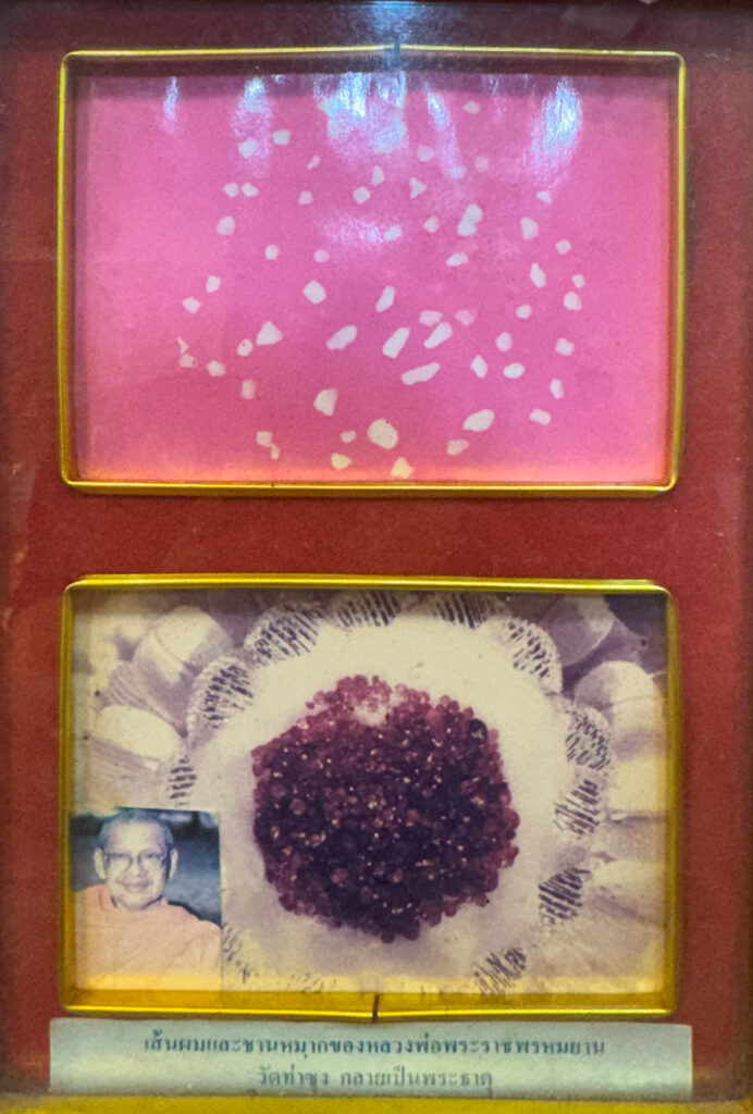 至今龙婆帕拉沙蓬玛雅师尊已经圆寂了33年,肉身不坏。头发上都是晶莹剔透的舍利子。