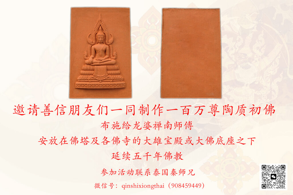 邀请善信朋友们一同制作一百万尊陶质初佛,布施给龙婆禅南师父,安放在各佛寺的佛塔及大雄宝殿或大佛底座之下,延续五千年佛教。